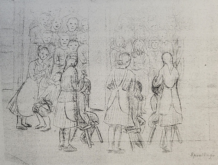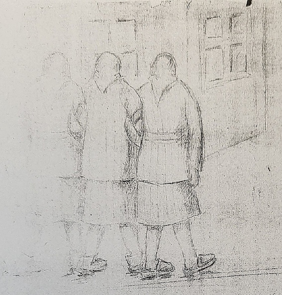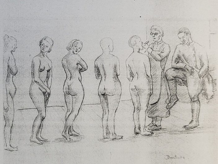 Un beau matin, à 9 heures, appel de ma table et de beaucoup d'autres pour partir en transport, c'est-à-dire en commande de travail. Soi-disant visite médicale. Dehors il pleuvait, nous étions nues, défense de nous couvrir. Nous attendions. À midi, une Allemande nous baragouina que le docteur est parti déjeuner, qu'il reviendra à 14 heures. Et nous, toujours debout, toujours nues... Peut-on imaginer ce spectacle. C'est vraiment gênant et pas joli du tout, répété à tant de modèles !!...