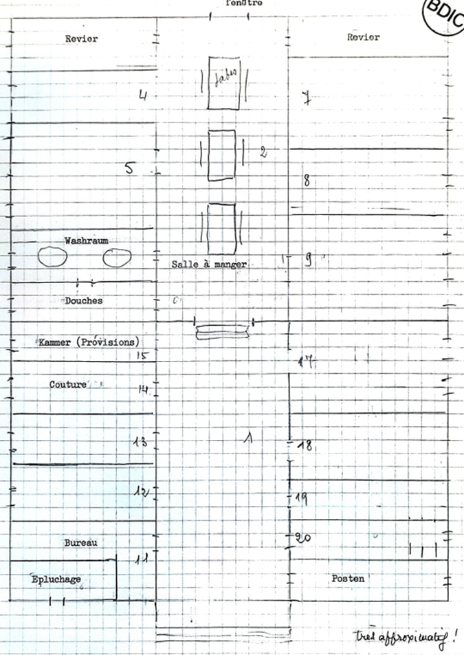 Là, on appelait "block" chaque grande pièce. Elles étaient grandes pour contenir 300-400-600 femmes. Toujours quatre étages de lits !! Sans m'étendre, je peux dire que le calvaire fut l'endurance de la schlague, les bombardements incessants et la lutte contre la faim. Souvent le pain était à peine distribué que l'on entendait « Ça y est, on a volé mon pain ». Mais oui, que de femmes se sont abaissées à voler leurs compagnes. Et puis, les punaises qui dégringolaient comme grêle sur nos têtes la nuit. Et les poux ? C'est une autre expérience ! Quelle prolifération !! On les cherchait tous les jours, mais rien n'y faisait. Quel supplice ! Je ne leur reconnais qu'une qualité, ils ne sautent pas comme des puces.