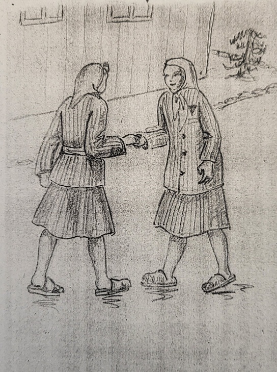 Quand notre quarantaine a été finie, nous sommes allées au bloc 31. Beaucoup ont été désignées pour travailler. Nous devions porter les bidons de soupe : il fallait s'y mettre à quatre. La vie de ces blocs était infernale, quel tapage !! et pourtant un « taisez-vous » tonnait de temps à autre. Disons que c'était une société hétéroclite !! Beaucoup d'aristocratie, beaucoup de communistes mises en prison par le Maréchal Pétain, libérées par les Allemands et envoyées en camp de concentration, beaucoup aussi de femmes de généraux et ce qui était émouvant, il y avait beaucoup de femmes âgées qui n'ont pas résisté.
