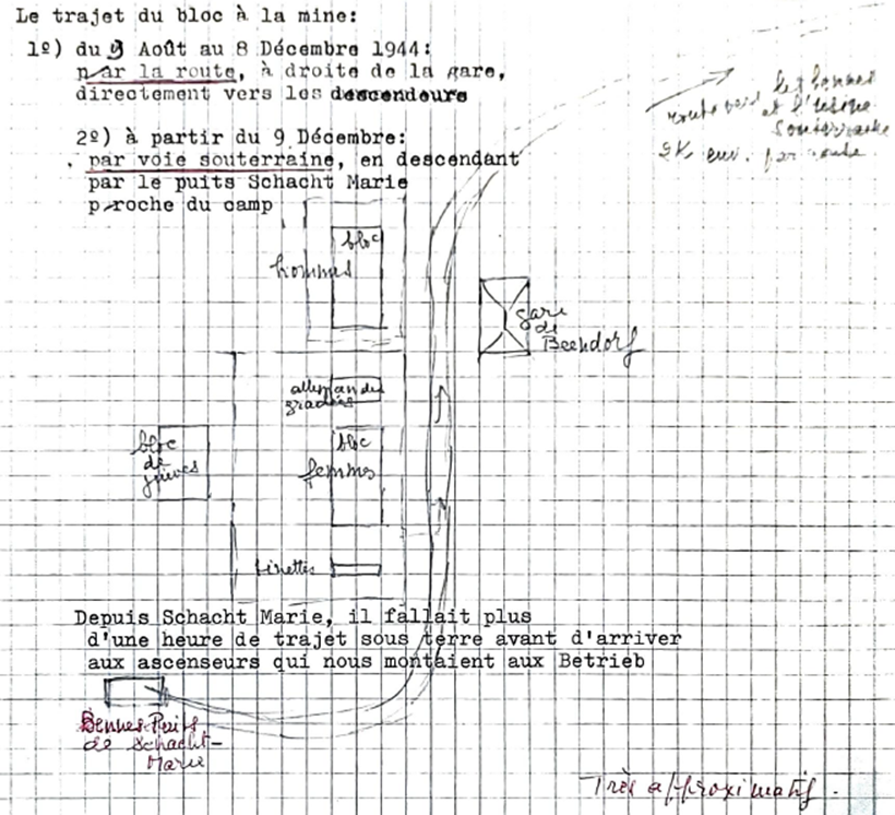 Notre vie à Beendorf-Bartensleben fut très dure : 14 heures sous terre ; levées à 3 h 1/2 nous quittions le camp à 5 h à l'obscurité ou au clair de lune, nous ne revenions qu'à 19 h et souvent plus tard, car ayant quitté l'atelier à 17 h 30 nous n'arrivions à l'air libre qu'à 19 h. Mais quand il y avait alerte les ascenseurs stoppaient, ce qui souvent nous obligeait à rentrer à 22 ou 23 h.
